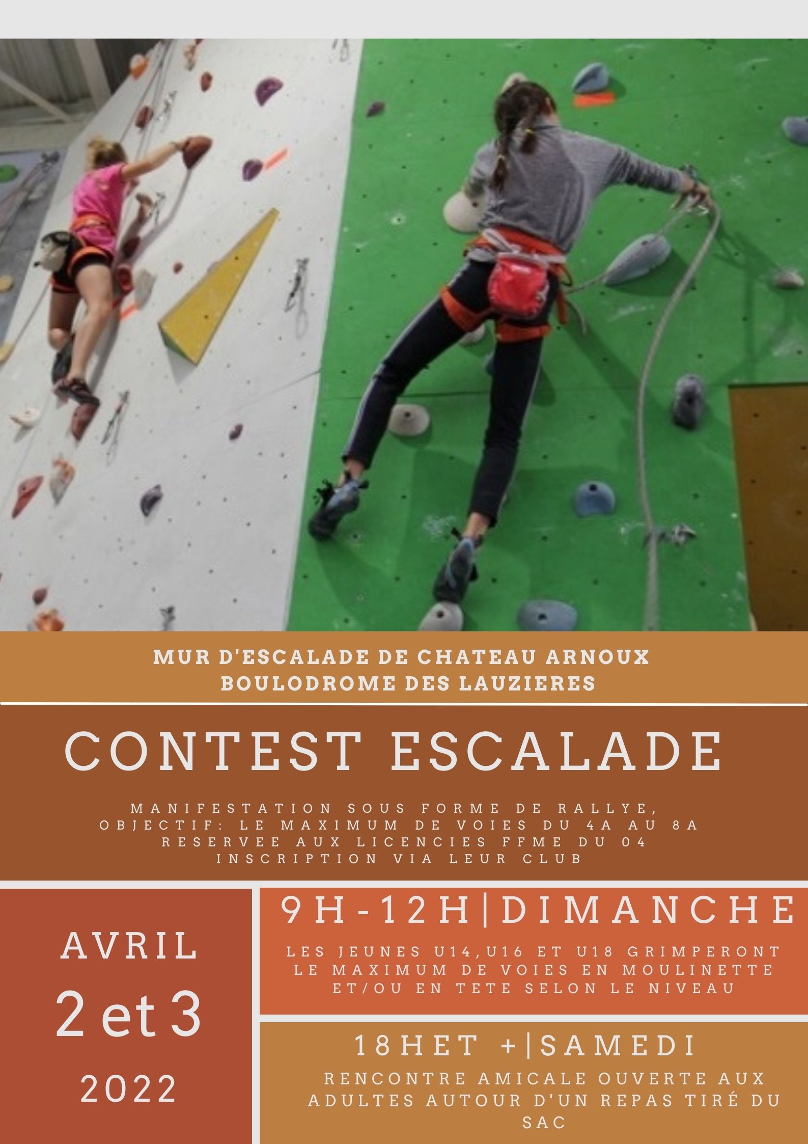 Le prochain contest aura lieu le WE du 2 et 3 avril à Château Arnoux. Le samedi soir à partir de 18H pour les adultes et le dimanche matin de 9H à 12H pour les 12 à 18 ans. Comme le précédent, l'idée est que tous puissent grimper.